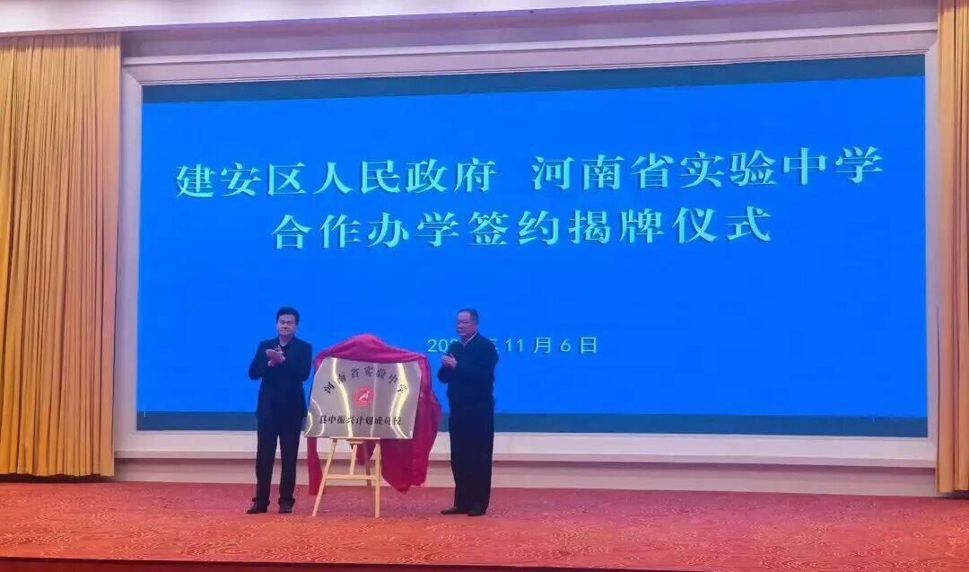 11月6日,许昌市建安区人民政府与河南省实验中学成功举行教育合作签约揭牌仪式,这标志着河南省实验中学与建安区第一高级中学的合作办学揭开了新的篇章。