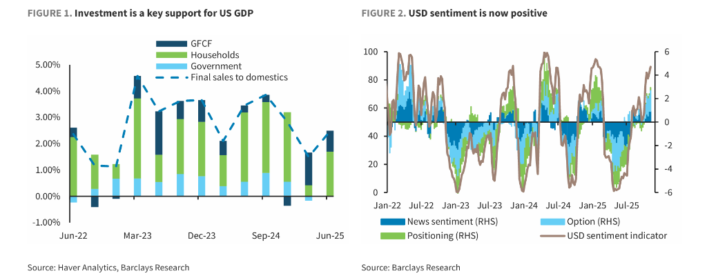 这一趋势已开始在宏观数据中显现。2025年前两个季度,投资项目对美国GDP的贡献升至每季度年化1个百分点,为2023年以来的最高水平。美元情绪指标目前已转为正值区间,表明市场对美元的看法正在改善。